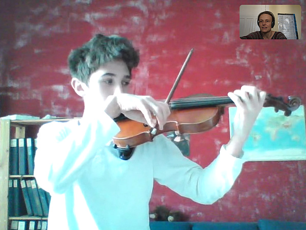 ![]() | Gabriel (14) hat Geigenunterricht per Skype bei Stephanie Thunert, Fachgruppenleiterin Streichinstrumente am Standort Weißensee. | |