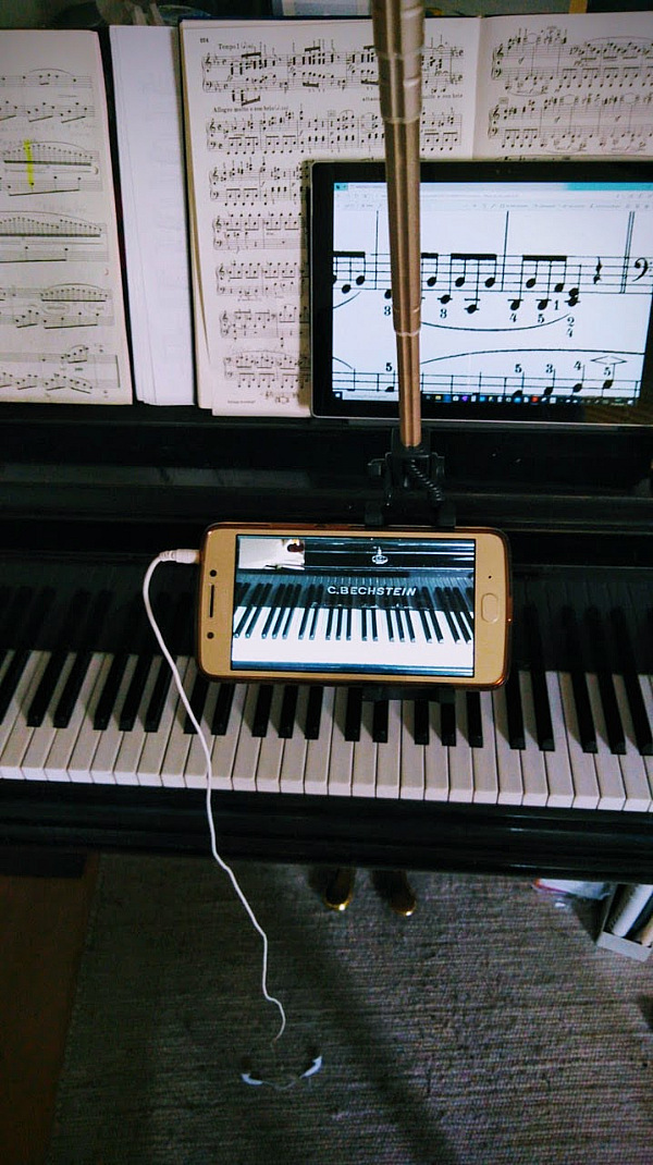 ![]() | „Help yourself-i-Stick“: Klavierlehrer Stefan Lang hat aus einem Mikrofonständer und einem Selfistick eine Halterung für das Unterrichten per Smartphone zusammengesteckt. | |