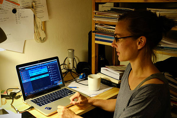 ![]() | Julia Sahle mixt am Laptop die Einzelaufnahmen für das Klassenprojekt Beethoven meets Corona. | |